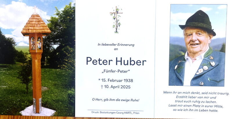 Schützenmeister Markus Krieg dankte in seiner Traueransprache in der Kirche für 70jährige Mitgliedschaft bei der Schützengesellschaft Staudach-Egerndach und zitierte eine Anekdote vom „Fünfer Peter“: „Als anfangs noch in der Mauth geschossen wurde, da hatte jeder Schütze drei Schuss über den Köpfen der Anderen – da hat keiner Aufstehen dürfen!°“. Peter Huber war in der Staudacher Schützengesellschaft Sportwart von 1980 bis 1984, Zweiter Schützenmeister von 1984 bis 1994, Erster Fähnrich von 1994 bis 1997, Ausschuss-Mitglied von 1994 bis 2000, Zweiter Jugendleiter von 2000 bis 2007 und seit 2004 war er Ehrenmitglied. Zu Ehren des Verstorbenen gaben auf dem Friedhof die Böllerschützen des Schützenvereins einen Ehrensalut. Peter Huber war nicht nur ein treffsicherer Schütze, sondern auch ein Trachtler mit viel Herzblut. Daran erinnerte in seinem Nachruf Staudachs Trachtenvorstand Andreas Mader mit den Worten: „Mit 16 Jahren trat der Peter dem Verein bei und von 1958 bis 1995, also über 35 Jahre war er unser Jugendleiter. Generationen von Staudachern haben von ihm Platteln, Tanzen und Drahn gelernt. Zudem war er von 1961 bis 1966 Vorplattler und von 1966 bis 1983 Zweiter Vorstand“. Der „Fünfer Peter“ war auch Gründungsmitglied der Gaugruppe beim Chiemgau-Alpenverband, er gehörte dieser auch bis 1967 an. Die Trachtensache war ihm ein Leben lang ein Anliegen, oftmals als Holzknecht auf dem Festwagen oder zuletzt auf dem Leutwagen. Für seine trachtlerischen Verdienste wurde er vom Staudacher Trachtenverein zum Ehrenmitglied ernannt, ihm wurden vom Chiemgau-Alpenverband das Goldene Verdienstzeichen sowie ein weiteres Verdienstzeichen von der Bayerischen Trachtenjugend verliehen. Die volksmusikalisch geprägte Trauerfeier in der Kirche gestalteten der Brander Zwoagesang und Peter Holzner auf der Ziach.