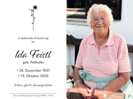 Eine überaus große Trauergemeinde nahm in der Pfarrkirche „Darstellung des Herrn“ in Aschau i. Chiemgau Abschied von Ida Feistl, die nach kurzer Krankheit im Alter von 87 Jahren verstarb. Ida Feistl war nicht nur Mittelpunkt einer Großfamilie mit vier Kindern, neun Enkelkindern und elf Urenkel-Kindern sondern ob ihrer geselligen und hilfsbereiten Art in der gesamten Gemeinde sowie bei den Orts- und Brauchtumsvereinen recht geschätzt.