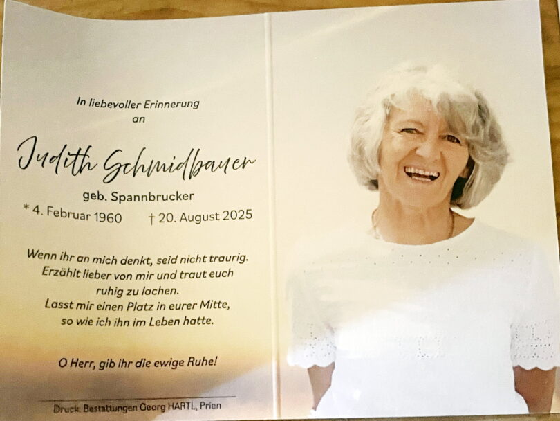 Im Alter von 65 Jahren und nach kurzer, schwerer Krankheit verstarb Judith Schmidbauer aus der Marktgemeinde Prien. Die Verstorbene war ob ihrer langjährigen Tätigkeiten im Tourismus und aufgrund ihres ehrenamtlichen Engagements beim TUS Prien bekannt und beliebt.
