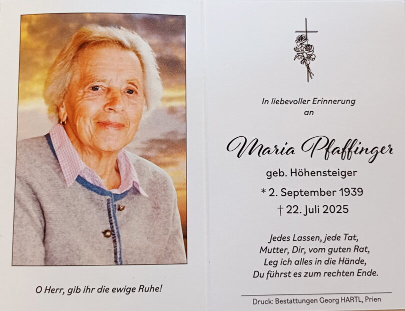 Im Alter von 85 Jahren verstarb nach längerer Krankheit Maria Pfaffinger aus Weisham in der Gemeinde Bernau a. Chiemsee. Überaus groß war die Anteilnahme an der Auferstehungsfeier in der Kuratiekirche „St. Bartholomäus“ in Hittenkirchen mit Pfarrer Philipp Werner sowie mit Hittenkirchener Bläsern. Besonders verdient gemacht hatte sich die Verstorbene für den Trachtenverein „Almenrausch“ Hittenkirchen.