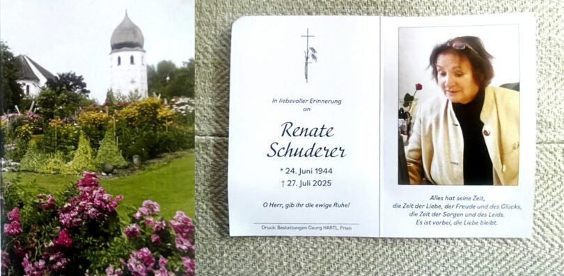 Bei der Trauerfeier in der Priener Pfarrkirche „Mariä Himmelfahrt“ erinnerte Pater Livio ebenfalls an einen Herzensmenschen, der mit seiner Fürsorge, mit seinen Gaben und mit seiner Lebensfreude niemals sein Geburtsland Tirol mit ihrer Heimatstadt Innsbruck und die ihr anvertraute Familie vergessen hatte. Schwere Schicksalsschläge waren der Tod ihres neunjährigen Sohnes und vor neun Jahren der Tod ihres Ehemannes Hans. Wie ihr Sohn Markus bei der Trauerfeier in der Kirche sagte, lernte sie als ausgebildete Einzelhandelskauffrau ihren Mann Hans kennen. Schon früh übernahm sie bei einem Architekten Verantwortung. Ein Glücksfall war es dann, dass Hans Schuderer im Priener Krankenhaus als Pfleger und Pflegedienstleiter Arbeit fand. Daraus entstand eine lebenslange Freundschaft mit dem damaligen Verwaltungsleiter Michael Anner senior. 50 Jahre bis zum Tod von Hans Schuderer währte die Ehe mit seiner Frau Renate. Diese fand in Prien zuerst im gemeindlichen Bauamt bei dessen Leiter Max Priller eine Anstellung, dazu hieß es weiter: „Renate Schuderer mochte die Leute und Arbeit, ihr Beruf war zugleich Berufung und als Sekretärin war sie für vier Bürgermeister und die Geschäftsleiter eine Kollegin, die Zuhören und Mitdenken konnte“.