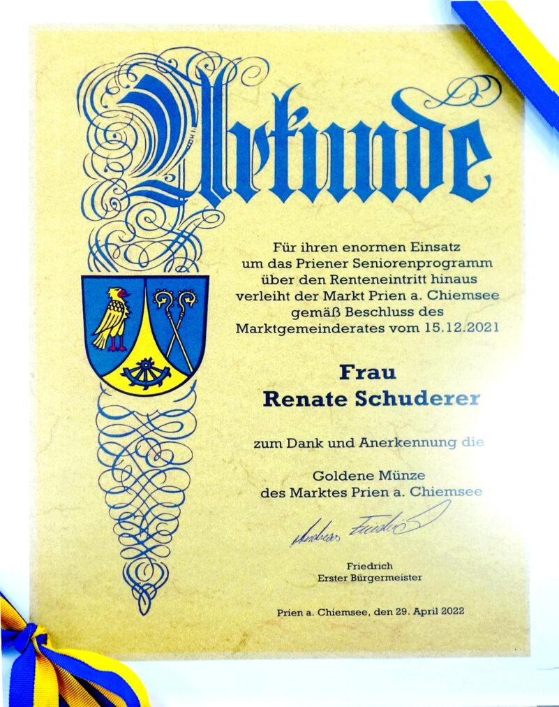 Sterbefoto: Renate Schuderer / Urkunde Goldene Münze / Fotos: Helga Stampfl (Seniorenprogramm)
