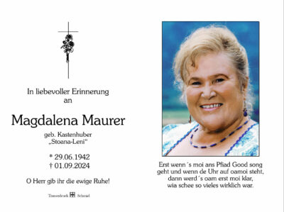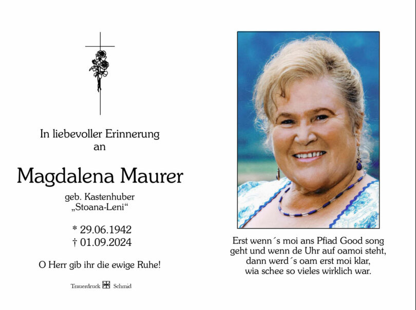 Im Alter von 82 Jahren verstarb nach liebevoller Fürsorge durch das Christliche Sozialwerk sowie im Kreise ihrer Familie und in ihrem vertrauten Zuhause Leni Maurer, bekannt als die „Stoana-Leni von Anker“. Beim Trauergottesdienst in der Kirche „St. Bartholomäus“ Rossholzen mit musikalischer Gestaltung durch Orgel und Kirchenchor erinnerte Diakon Günter Schmitzberger an eine starke Persönlichkeit, die sich trotz schwerer Schicksalsschläge nicht aufgegeben hat. So verlor Leni Maurer im Mai 1982 durch einen tragischen Unfall ihren Mann Peter.