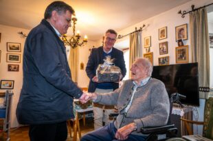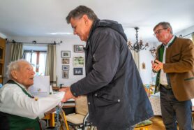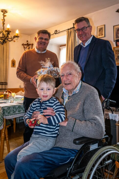 Freude bereiteten Xaver Stadler die vielen Glückwünsche und persönlichen Gratulationen zu seinem 100. Geburtstag, besonders als ihm die Samerberger Musikanten den von ihm gewünschten Heimatland-Marsch und die Bayernhymne spielten. Eine aussergewöhnliche Freude war es ihm, dass er mit Hilfe seiner Familie seine ehemalige Schulkollegin und Nachbarin Maria Wörndl vom Gasthof Alpenrose besuchen durfte. Frau Wörndl konnte wenige Wochen vor ihm in ebenfalls guter gesundheitlicher und geistiger Verfassung ihren 100. Geburtstag feiern. Nach den doch lebhaften Tagen rund um seinen Geburtstag ist es wieder ruhiger, dann hat Xaver Stadler wieder mehr Zeit für seine Kreuzworträtsel und für das Schafkopfen.
