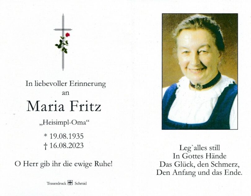 Eine überaus große Trauergemeinde, darunter viele in Tracht gekleidete Personen, begleitete Maria Fritz (“Heisimpl-Oma”) auf dem Friedhof in Altenbeuern zu ihrer letzten Ruhestätte. Dort wurde ihr Leichnam in das Familiengrab gelegt, das auf geweihter Erde ruht. An diesem Tag wäre sie 88 Jahre alt geworden. Ihr langes und arbeitsreiches, jedoch stets bescheidenes Leben fand somit einen würdigen Abschluss im Kreise der Dorf- und Glaubensgemeinschaft.