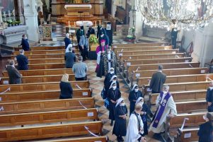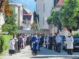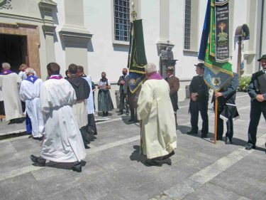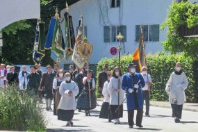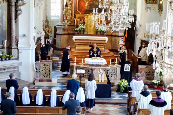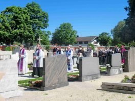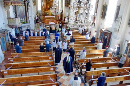 Zu Beginn des Requiems überbrachte Pfarrer Klaus Hofstetter den vielen anwesenden Geistlichen auch die Grüße von Mitbruder Gabriel Kreuzer, dem Kurssprecher des Weihejahrgangs 1958. Wolfgang Bischof, Bischofsvikar für die Seelsorgeregion Süd des Erzbistums München und Freising dankte namens von Kardinal Reinhard Marx dem Verstorbenen für dessen Bescheidenheit und treue Verkündigung von Gottes Botschaft. Seine Predigt begann der Weihbischof mit dem umgangssprachlichen Satz „Undank ist der Welten Lohn!“. Damit erinnerte er an Pfarrer Kronast, der die Dankbarkeit im hohen Alter an seinem 90. Geburtstag im Altenheim St. Josef besonders herausstellte. „Pfarrer Kronast hatte ein klares Hinorientiertsein auf Gott, auf dass die Liebe Gottes stärker ist als der Tod“, so Weihbischof Bischof und er würdigte dabei, dass Pfarrer Kronast sich auch in den letzten Minuten seines Lebens in Ruhe und im Beisein von Alten-Seelsorgerin Schwester Juliane geborgen fühlte bei Gott. Die Gestaltung der Beisetzungs-Feierlichkeiten übernahm Dekan Daniel Reichel im Beisein der Fahnenabordnungen der Veteranenvereine Schönberg und Rottenbuch, des Schützenvereins Rottenbuch und der Katholischen Landjugend Rottenbuch. Auch die dortige Feuerwehr wäre mit ihrer Fahne und einer Abordnung gekommen, doch hatten diese bei der Hinfahrt eine Autopanne, vor Ort half die Priener Feuerwehr für einen geordneten Trauerzug von der Kirche zum Friedhof . Die musikalische Gestaltung beim Einzug zum Requiem und auf dem Friedhof hatte eine Bläsergruppe aus den Reihen der Rottenbucher Blaskapelle unter der Leitung von Thomas Zeller. Wie dieser wissen ließ, war Pfarrer Kronast ob seiner Liebe zur Musik maßgeblich an der Wiedergründung der Blaskapelle Rottenbuch beteiligt. Die musikalische Gestaltung beim Requiem in der Kirche übernahmen ein Vokalensemble des Priener Kirchenchores und Organistin Judith Trifellner-Spalt unter der Gesamtleitung von Kirchenmusiker Bartholomäus Prankl.