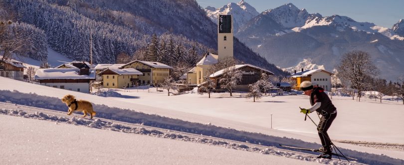 Viel Freude haben die Langlauf-Skifahrer derzeit bei den gut gespurten Loipen auf dem Samerberg – wie dieses Foto zeigt. Im Hintergrund Roßholzen mit Blick auf den Wendelstein. Bei den derzeit idealen Schnee-, Loipen- und Wetterverhältnissen sind auch in den nächsten Tagen traumhafte Freizeitsport-Möglichkeiten mit Langlauf-Skiern auf dem Samerberg zu erwarten.