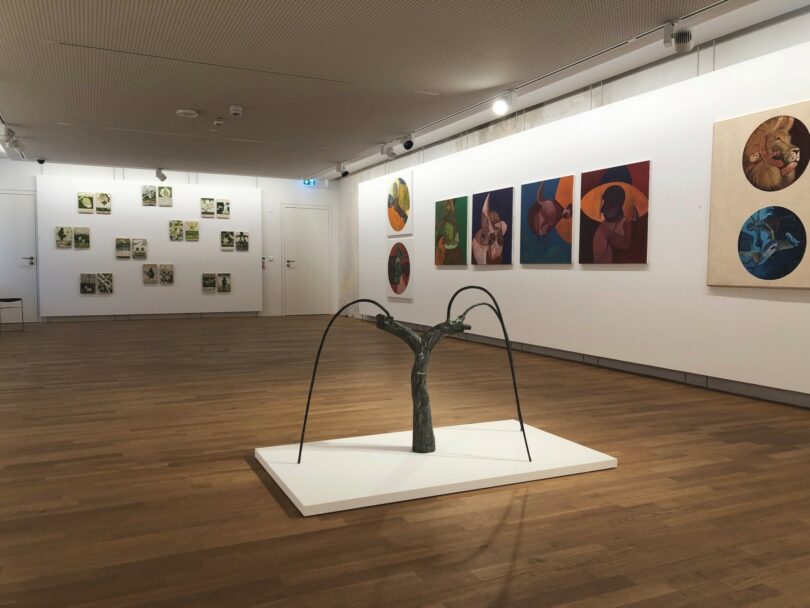 Abschlussrundgang durch „Das Symbol“  –  Pflanzen, Tiere, Figuren, Gegenstände, Farben und Formen – alles kann in der Kunst der Gegenwart zum Symbol werden.  Unser Foto zeigt die Arbeiten „Der andere Garten“ der Künstlerin Almut Wöhrle-Russ, die symbolträchtigen Phantasiewelten des Malers Oliver Stephan und die Bronzeskulptur „Der Rebstock“ des Bildhauers Stefan Forler.