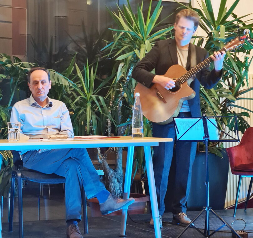 Der Literaturwissenschaftler und Autor Dr. Alois Prinz und Johannes Öllinger, der für die musikalische Unterhaltung sorgte.