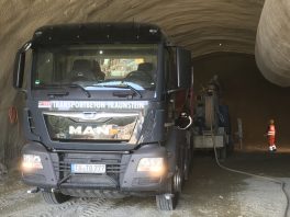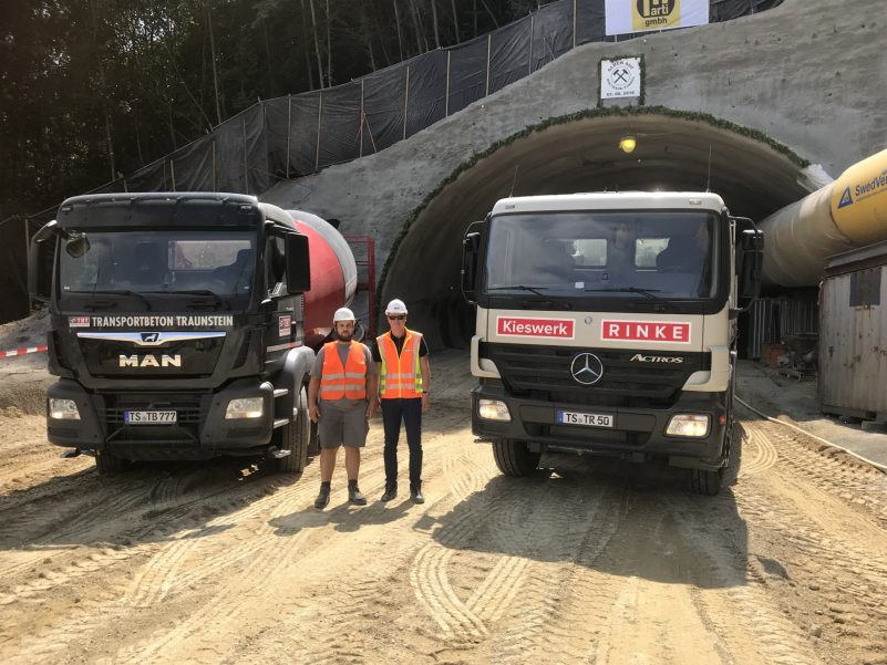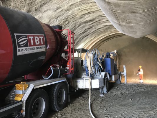 Während im April 2018 der Spatenstich zum Projekt „Aubergtunnel“ in Altenmarkt erfolgte und die Betonlieferungen bereits seit Mitte Juli laufen, kam es nun zum feierlichen Tunnelanschlag. 2021 sollen die ersten Fahrzeuge durch den 440m langen Tunnel rollen. Dass es bis dahin noch einiges zu tun gibt, weiß Thomas Janzen, Geschäftsführer der Betonlieferfirma Transportbeton Traunstein GmbH: „Wir planen, dass bis Weihnachten 2018 die Spritzbetonlieferungen für die Kalotte des Tunnels beendet sind. Gearbeitet wird dabei im Dreischichtbetrieb rund um die Uhr von Montag bis Sonntag. Ab Januar 2019 geht es dann mit dem Spritzbeton für die Strosse und Sohle des Tunnels weiter.“