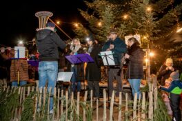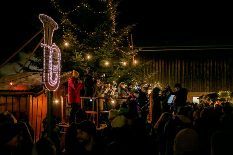 Unter der Leitung von Lothar Beyschlag sorgten nachmittags die Jugendblaskapelle und die Uhus für die musikalische Umrahmung des stimmungsvollen Adventsmarktes. Nach Einbruch der Dunkelheit schallten vom nahegelegenen Balkon Weisen, Advents- und Weihnachtsstücke, vorgetragen vom „Balkonbläserensemble“ unter der Leitung von Blaskapellentrompeter Phillip Hauth – später am Abend spielte dann noch das Blechensemble am Stand des Musikvereins auf.