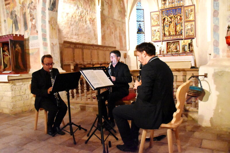 Die drei Tiroler Klarinettisten Florian Mühlberger, Stephan Moosmann und Christoph Schwarzenberger des „Trio con Brio“ waren nicht zum ersten Mal in der Kirche und neben ihrer Fangemeinde aus Tirol hatten sich auch viele Besucher aus dem Achental eingefunden. Gleich beim ersten Stück „Triosonate d-moll“ von Johann Sebastian Bach bewiesen die Künstler, dass sie ihrem Namen alle Ehre machen. Der Begriff „con brio“ stammt aus der italienischen Sprache und steht für „Schwung und lebhaft feurig“. Weiter ging es mit Wolfgang Amadeus Mozart, von dem behauptet wird, dass das Bassetthorn (hier gespielt von Stefan Moosmann) sein Lieblingsinstrument gewesen sein soll, wie Florian Georg Mühlberger berichtet. Bei dem Stück „Divermento Nr. 2“ gab dieses Instrument tatsächlich die Würze, Abwechslung und Tiefe.
