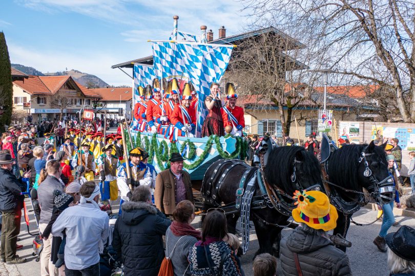 Ab Samstagmittag verstärkte sich ein ständiger Strom an Zuschauern in das Ortszentrum Unterwössens. Ziel war die Hauptstraße vor allem in Höhe des Alten Bades. Helfer zäumten dort die schweren Zugpferde und sattelten die Reitpferde. Rundherum Leute in aufwändigen historischen Gewändern, historische Bauersleute mit ihren Kindern und fahrendes Zigeunervolk. Stände überall an der Hauptstraße sorgten für das leibliche Wohl der überwiegend verkleideten Zuschauer, die zuletzt dicht gedrängt auf den Bürgersteigen entlang der Hauptstraße standen. Um 14.14 Uhr schnalzten beim Aperschnalzen an der oberen Hauptstraße die Passen ihre Goaßln, dicht umlagert von den Zuschauern am Straßenrand. Ein Triumphzug setzt sich in Bewegung. Immer mehr Gruppen aus den Seitenwegen schließen sich an und ein prachtvoller Zug entsteht.