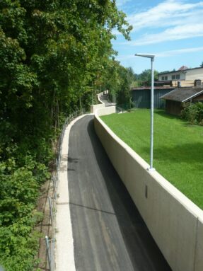 Der Weg ist beleuchtet und bietet mit einer Breite von 2,50 Metern ausreichend Platz für Begegnungen in beide Richtungen. Dabei sorgen nicht nur Straßenlaternen für Licht von oben: Alle 60 Meter in die Mauer eingelassen, bringen beleuchtete Tafeln mit dem Wappen der Stadt zusätzliche Helligkeit und Orientierung. Am Weg entlang führt die 576 Meter lange Hochwasserschutz-Mauer. Sie passt sich dem Gelände an und überzeugt durch ihre Gestaltung: Verwendet wurde gefärbter Beton, dessen Oberfläche gestockt wurde. In der Folge entsteht eine Optik, die der eines natürlichen Nagelfluh nachempfunden ist.