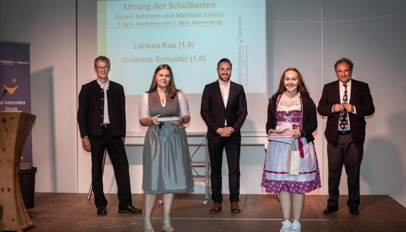Die Schülerinnen und Schüler wurden einzeln auf die Bühne gerufen und empfingen unter den lobenden, charakterisierenden, aber auch wehmütigen Worten ihrer Klassenleiterinnen und Klassenleiter die Zeugnisse. Auf eine Leinwand im Hintergrund waren dabei Bilder aus dem Leben der jeweiligen Klasse projiziert. Im Anschluss daran wurden die Schulbesten geehrt, wozu eigens die Bürgermeisterinnen und Bürgermeister der verschiedenen Heimatgemeinden gekommen waren. So durfte Randolf John Daniel Artmann aus Rosenheim, Matthias Jokisch aus Brannenburg, Dieter Kannengießer aus Kolbermoor, Martin Riedl aus Baiern, Anna Wallner aus Bruckmühl, Hans Schaberl aus Feldkirchen-Westerham, Anton Wallner aus Bad Feilnbach und last but not least Stephan Schlier, den neuen ersten Bürgermeister von Bad Aibling, begrüßen. Dieser forderte in einem Grußwort die Absolventen dazu auf, ihre Zeit sinnvoll zu nutzen und Bad Aibling verbunden zu bleiben, denn „wir brauchen euch“.