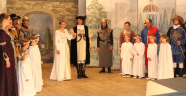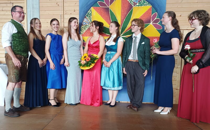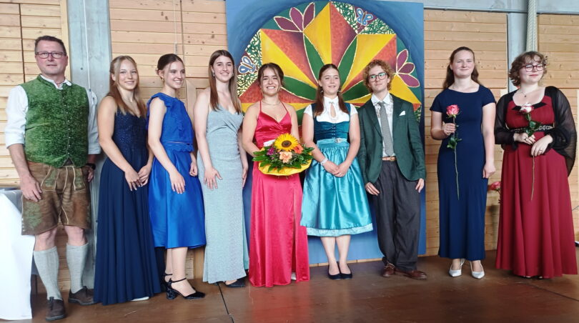 Bericht und Bilder: Christiane Giesen – Die zwei besten Absolventen der Mädchenrealschule Maria-Ward in Sparz wurden von Schulleiter Günther Miller )auf der Bühne geehrt, (von links) Katharina Wilhelm, Viktoria Neugebauer, Lucia Lohwieser, Helena Wimmer, Lilli Neubauer, Emilio Grafetstetter, Anna Geißelbrecht und Judith Bauer.