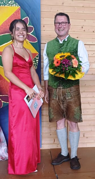 Danach gab Schülersprecherin Jana Baumgartner, einen kurzen humorvollen Rückblick auf ihre Schulzeit seit dem Jahr 2019 und erwähnte die ereignisreichen Abschlussfahrten nach Kroatien, Wien, den Gardasee und London. Wenn sie und viele andere jetzt auch ein bisschen Angst, vor dem, was jetzt kommt, hätten, erinnerte sie daran, was alle bis jetzt schon geschafft hätten – „wir haben so viele letzte Male schon hinter uns“, so dass alle den weiteren Weg sicher auch gut schaffen würden. Sie und die Klassensprecher dankten Lehrerkollegium, Direktorat, Verwaltung und Eltern für die liebevolle und umsichtige Begleitung in den vergangenen Schuljahren und überreichten liebevoll ausgesuchte Geschenke an viele Lehrer.