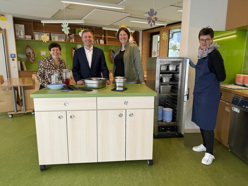 Der steigende Bedarf an Mittagessen hängt mit veränderten gesellschaftlichen Anforderungen zusammen: Berufstätigkeit, flexible Betreuungszeiten und der Wunsch nach einer guten, kindgerechten Verpflegung sind längst Alltag. „Ein warmes Mittagessen ist nicht nur eine Frage der Versorgung, sondern auch ein Stück Teilhabe und Lebensqualität“, so die Einrichtungsleitung Regina Enzinger. Um die steigende Zahl der Essenskinder zu versorgen, wurde im vergangenen Jahr kräftig investiert und umorganisiert. Neue Teller, Besteck und Gläser wurden angeschafft, ebenso ein großer Bankettwagen, der die Speisen zwischen Anlieferung und Essensbeginn warmhält. Auch neue Servierwagen und ein mobiler Küchenblock kamen hinzu – gefertigt von der regionalen Schreinerei und Rechenmacherei Erich Langwieder.
