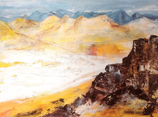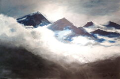 Ingrid Bauer ist derzeit von ihrer Lieblingsfarbe Rot abgewichen, sondern zeigt diesmal abstrakte, ruhigere, eher beruhigende Naturimpressionen in blau, grau weißen Farben wie das Bild „Wolkengrenze“, das Meer in Acrylfarben mit Sand vermischt oder „Weites Land“, durch die sie ihre starke Beziehung zur Natur Ausdruck geben kann. Ruhig, fast abgeklärt wirken „Meine Berge“ von Gisa Beyreuther: Fünf Gemälde von I bis V alle mit dem gleichen Titel, denn aus gesundheitlichen Gründen nimmt sie nun langsam Abschied von ihren Bergen. „Hier habe ich die Berge aus der Erinnerung gemalt – ein Ort, wo ich mich immer wohl fühlte“, so die Künstlerin. Lang lebte sie in Namibia, in Wüstenregionen, dann in Bayern. Wo auch immer sie mit ihrer Familie war, nahmen für sie als ehemalige Sportlehrerin und Kunsterzieherin die Berge eine besonders wichtige Rolle ein. Von zu Hause in Bernhaupten, Bergen kann sie bis heute bei jedem Blick durchs Fenster auf den Hochfelln blicken.