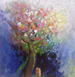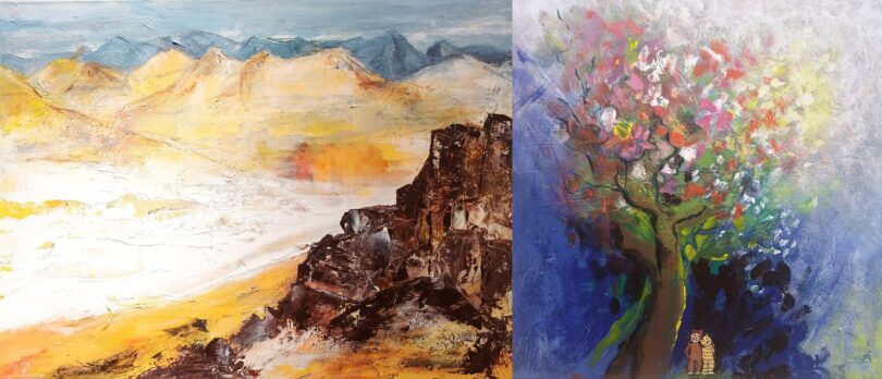 Ingrid Blüml, Grassau, zeigt auch heuer wieder ihre Kunst, konkret, gegenständlich zu malen und doch sensibel ihren Gefühlen Ausdruck zu verleihen: bei „Erschöpft“ – eine Frau im Sessel mit aufgestütztem Kopf, „Ausgegrenzt“, eine Frau, die sich offensichtlich nicht den anderen Frauen zugehörig fühlt, oder die inspirierten Bilder der „Hommage an Janosch“ mit einem bunt blühenden Baum und den kleinen Tiger und Bären darunter, oder die „Hommage an Exter“ – keine Kopie von Exters Blumenweg, aber eine ganz eigene Wiedergabe in sanften Farben. Bei Heidi Machatschek-Flieher, die wieder den Hauptteil der Organisationsarbeit übernommen hat, stehen diesmal Ansichten von Reisen im Mittelpunkt wie „Paysage Andaluz“ mit sehnsuchtsvollen Erinnerungen vom Strandleben und Urlauben. Aber die Ansicht von Traunstein und vom vom Traunsteiner Stadtplatz mit golden glänzenden Kuppeln, fast orientalisch anmutend, dürfen bei der Traunsteinerin natürlich nicht fehlen Ihr großes Thema ist immer die Heimat, auch weitere „Heimaten“, mit denen sie gegenwärtige gesellschaftliche Entwicklungen anspricht.