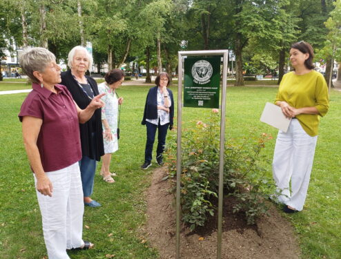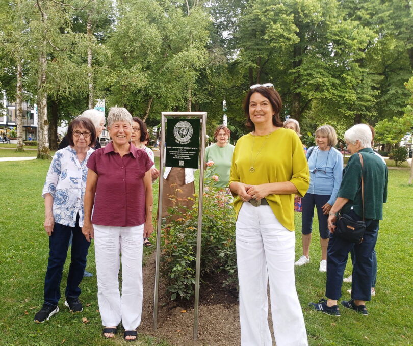 An die zweite Bürgermeisterin der Stadt Traunstein, Walburga Mörtl-Körner (links vom Schild) übergaben die Präsidentin des Soroptimist Club Traunstein, Martha Selbertinger (rechts) und einige Mitglieder des Clubs symbolisch ein Beet mit Rosenstöcken im Stadtpark als Geschenk zum 650. Stadtjubiläum.