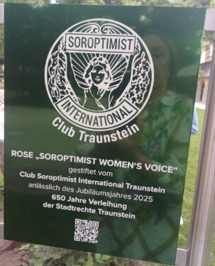 Die Rose „Soroptimist Women`s Voice“ ist eine Kreuzung aus „Rosa Melglory“ mit „Golden Celebration“. Sie wird etwa 80 Zentimeter hoch und bezaubert durch ihren sehr angenehmen Duft. Wie Präsidentin Martha Selbertinger weiter ausführte, soll sie „ein Symbol für die Kraft und die Stimme der Frauen in unserer Gesellschaft und in der gesamten Welt sein.“ Sie stehe symbolisch für Frieden, Freiheit und Gerechtigkeit in Europa und der Welt. Im Club waren neben Dr. Henriette Hirschmüller vor allem auch Konstanze Reichert-Kegel und Dr. Christina Heuer an dem Projekt beteiligt. Der Club mit Schatzmeisterin Anne Lindenberg erwarb nicht nur die Rosenstöcke, sondern ließ ein stabiles Schild aus Edelstahl mit dem Logo des SI-Clubs anfertigen und der Aufschrift: „Rose Soroptimist Women`s Voice“ / gestiftet vom Club Soroptimist Traunstein International / anlässlich des Jubiläumsjahrs 2025/ „650 Jahre Verleihung der Stadtrechte“.