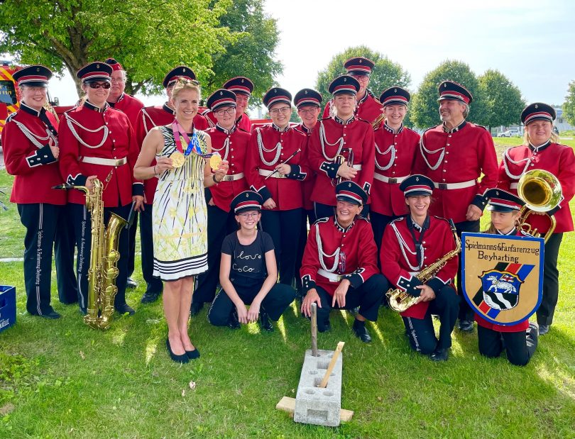Einen Empfang vor dem Rathaus gaben die Gemeinde Tuntenhausen und der Landkreis Rosenheim für Doppel-Olympiasiegerin Jessica von Bredow-Werndl – davon diese Bilder, unter anderem beim Eintrag ins Goldene Buch mit Bürgermeiser Georg Weigl, mit stellvertrendem Landrat Josef Huber sowie mit dem Spielmanns- und Fanfarenzug Beyharting.