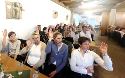 Gestärkt und gefördert wird UadB Chiemsee-Wendelstein über den Landkreis Rosenheim und Tourismusverband Chiemsee-Alpenland hinaus noch von vielen Seiten. Der Landesverband „Blauer Gockel“ erläuterte mit der Vorsitzenden Gerda Walser und mit Geschäftsführerin Susanne Wibbeke aktuelle und neue Marketingmaßnahmen (u.a. mit Hilfe Münchner Straßenbahnen). Besonders begeistert zeigte sich Frau Wibbeke nach einem selbst mitgemachten Bastelabend für den viertägigen Bad Feilnbacher Apfelmarkt über das Engagement innerhalb der Rosenheimer Anbieterschaft. Dr. Anja Mayr vom Amt für Ernährung, Landwirtschaft und Forsten lud zu einem Betriebszweigentwicklungsseminar vom 8. Oktober 2024 bis 8. April 2025 (www.weiterbildung.bayern.de) ein, Markus Waldmann von Auerbräu schlug vor, nach der Saison eine Brauereiführung zu machen und das Ehepaar Kathrin und Josef Buchner vom Schmiedhof in Vogtareuth stellte sich als neues Mitglied vor (Michviehbetrieb mit zwei Chalets als zweites Standbein). In der freien Aussprache bat Martin Gruber aus Niederaudorf um seine Aufmerksamkeit zum Brenner-Nordzulauf und sagte: „Derzeit haben wir das Problem der weniger werdenden Gastwirtschaften, wenn die Baustelle ins Inntal mit rund 20 Jahren Bauzeit kommt, dann können wir zusperren“.