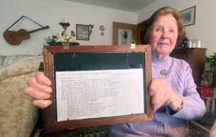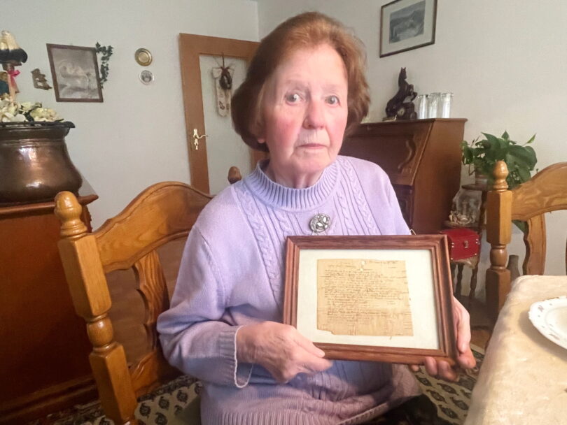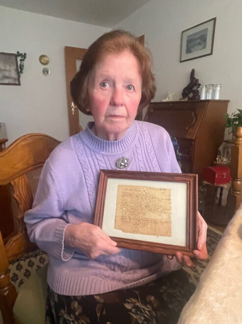 Fotos: Hötzelsperger – 1. Anneliese Flori mit dem Brief, den ihr Vater vor 80 Jahren aus Finnland an ihre Mutter und sie starb. 2. Der Brief (im Original leider etwas ausgebleicht, da er seit 1969 dem Licht in der Wohnung ausgesetzt war).
