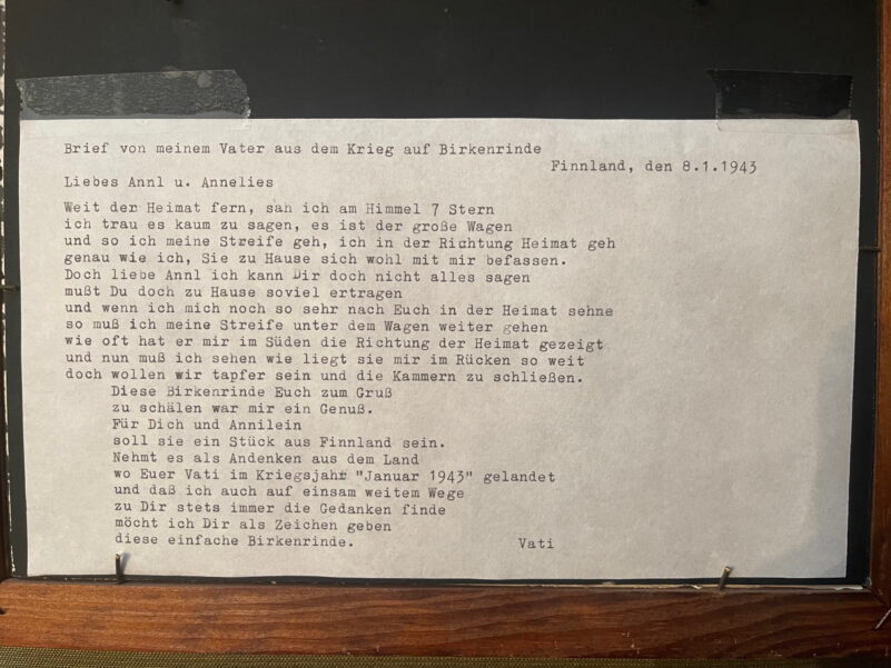 Den Brief ihres Vaters – geschrieben auf Birkenrinde mit feiner Feder und Tinte – entdeckte Anneliese als ihre Mutter im Jahr 1969 im Alter von nur 62 Jahren verstarb und sie ihren Nachlass sichtete. Als sie den Brief an das Tageslicht holte, war ihr erster Gedanke: „Der Brief bekommt einen Gedenk- und Ehrenplatz. Er hat in mir sofort die Gefühle wieder geweckt, die ich in mir von meinem Vater trug. Ich habe zwar keine persönliche Erinnerung, aber bevor mein Vater in den Krieg musste, nahm er mich auf den Arm, ich klammerte mich stark an ihn und er tanzte mit mir. Dieses Rhythmusgefühl ist in mir wachgeblieben“. Anneliese hat ihren Vater nicht mehr gesehen. Wegen Malaria kam er zwar einmal von der Front, aber dann wurde er nach Topola in Serbien versetzt und gilt dort als vermisst. Ihre Mutter unternahm viele Anstrengungen, um von ehemaligen Kameraden Näheres über seinen Verbleib zu erfahren, dazu aber weiß sie nur: „Von den Kameraden und Kontakten hat sie nur Fürchterliches erfahren, darüber sollte man schweigen“. Deswegen sind für Frau Flori jedes Gedenken wie der Volkstrauertag und auch die aktuellen Kriegsmeldungen auf der Welt eine Erinnerung, was Menschen mit Menschen getan und was Menschen den Menschen angetan haben.
