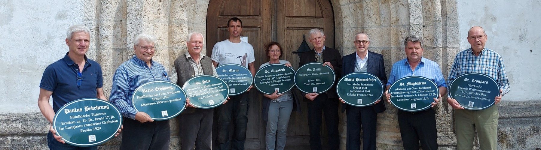 „Früher war ich eher seltener in Schnaitsee. Aber seit die Gemeinde Mitglied in der LEADER-Region „Chiemgauer Seenplatte“ ist, bin ich da schon fast dahoam“ sagte deren Vorsitzender Sepp Reithmeier, der auch Bürgermeister in Pittenhart ist. Vor dem ehrwürdigen Portal der Schnaitseer Pfarrkirche „Maria Himmelfahrt“ hob er das große Bürgerengagement in Schnaitsee hervor. Damit lobte er in diesem Fall den Heimatverein, der das Anbringen von Infotafeln an den zwölf Kirchen im Pfarrverband Schnaitsee vorangetrieben hatte. So konnten jetzt die Tafeln an die Kirchenpfleger der drei beteiligten Pfarreien übergeben werden. In den nächsten Tagen werden diese montiert und dann können an den drei Kirchen Maria Himmelfahrt, St. Anna und St. Elisabeth in Schnaitsee, an St. Nikolaus in Berg, an St. Johannes Baptist in Tötzham, an St. Leonhard in St. Leonhard, an St. Peter in Kirchloibersdorf, an St. Ulrich in Stadlern, an St. Paulus Bekehrung in Titlmoos, an St. Magdalena in Kirchstätt, an der Filialkirche Kreuz Erhöhung in Harpfing und an St. Martin in Waldhausen Besucher alle Infos rund um das jeweilige Gotteshaus erfahren. Für weitergehende Informationen sorgt auch ein angebrachter QR-Code.