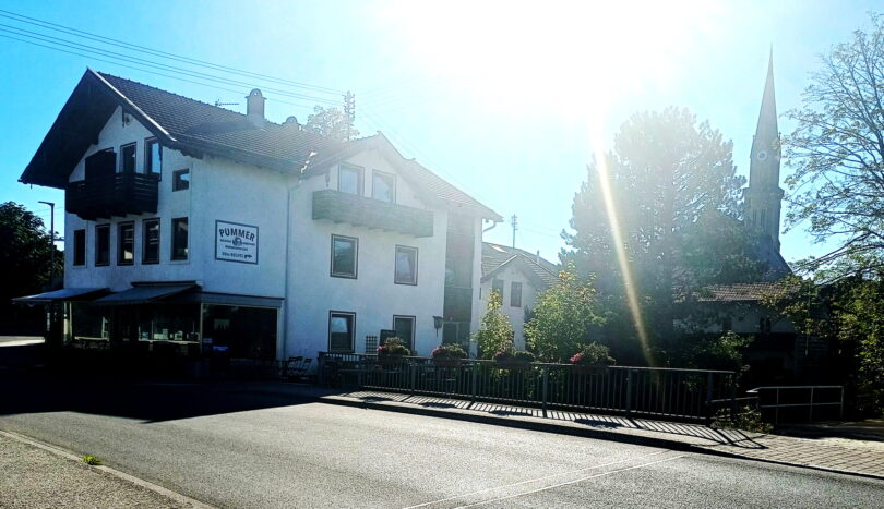 Bericht und Foto: Christiane Giesen – In der Ortsmitte von Übersee sollen die Gebäude in der Dorfstraße 14 und 16 hinter der Kirche abgerissen und durch einen Neubau ersetzt werden. Das vorne gelegene Haus mit der Bar soll erhalten und saniert werden.