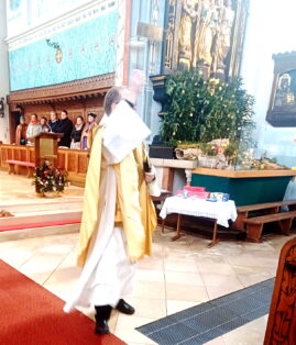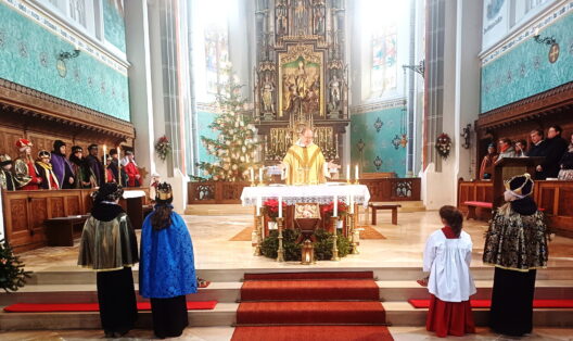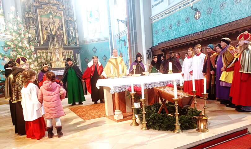 Im Rahmen eines gut besuchten Festgottesdienst am letzten Tag des Kirchenjahrs, Epiphanias, dem Tag der Erscheinung des Herrn, wurden die Sternsinger von der Kirchengemeinde empfangen. Pfarrvikar Christoph Zirkelbach zelebrierte den Gottesdienst, der musikalisch von Christian Dengler an der Orgel und dem Kirchenchor umrahmt wurde. Das Vaterunser beteten alle prächtig gekleideten Heiligen Drei Könige Kaspar, Melchior und Balthasar und jeweils einem Sternträger und alle Kinder im Gottesdienst im Kreis um den Altar. Während des Gottesdienstes segnete der Pfarrvikar Kreide und Weihrauch, damit sich die Gläubigen die geweihten Gegenstände auch selbst mit nach Hause nehmen konnten, um mit geweihter Kreide den Segensspruch C + M + B – Christus mansionem benedicat (Christus segnet das Haus) an ihre Haustüren zu schreiben.