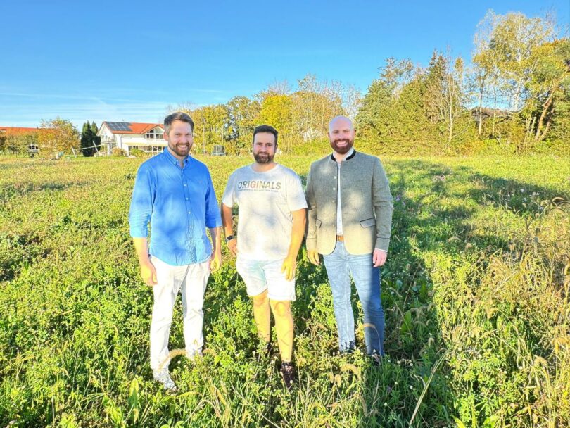 Bericht und Bilder: Klaus Hellmich, Unterwössen – Beim Ortstermin bei der Blühfläche: (Von links) Zweiter Bürgermeister und Ortsvorsitzender in Unterwössen Johannes Weber, landwirtschaftlicher Projektpartner und Gemeinderatsmitglied in Übersee Christian Maier, Stimmkreislandtagsabgeordneter und Stadtratsmitglied in Traunstein Konrad Baur. Bild: Klaus Hellmich, Unterwössen.