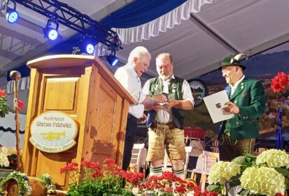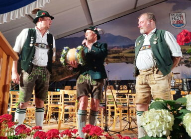 Strauch stellte kurz das Dorf vor, in dessen Vereinen sich Tradition und Weltoffenheit spiegle, besonders auch in dem heuer seit 50 Jahren bestehenden Musikverein Übersee-Feldwies. Er dankte besonders den Organisatoren des Festes und den unzähligen ehrenamtlichen Helfern sowie großzügigen Sponsoren, ohne die das Fest nie zustande gekommen wäre. Der Bezirksvorsitzende des MON Thomas Egger, überreichte symbolisch ein kleines Schnapsfassl zum Dank für die in Übersee geleistete Arbeit an den ersten Vorstand des Musikvereins Christian Kroner und den zweiten Vorstand und Festleiter Markus Genghammer (Foto).