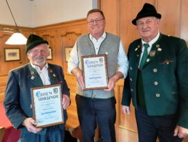 Das Gauehrenzeichen und die Gauehrenurkunde erhielten Heinrich Hafner und Sepp Utzmeier aus den Händen von Michael Bernauer.