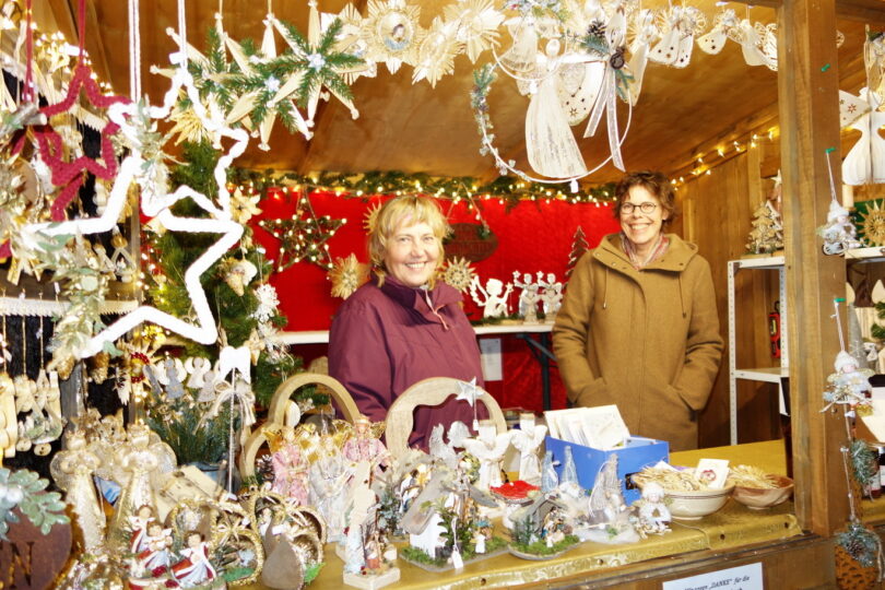 Fotos: Hötzelsperger – Eindrücke vom Stand des Chiemgauer Helferkreises für Ternopil/Ukraine mit vielen von den Mitgliedern gebastelten Geschenk- und Dekorations-Artikeln – u.a. im Stand Marianne Lankes (li.) und Katrin Halden-Spindler vom Helferkreis.