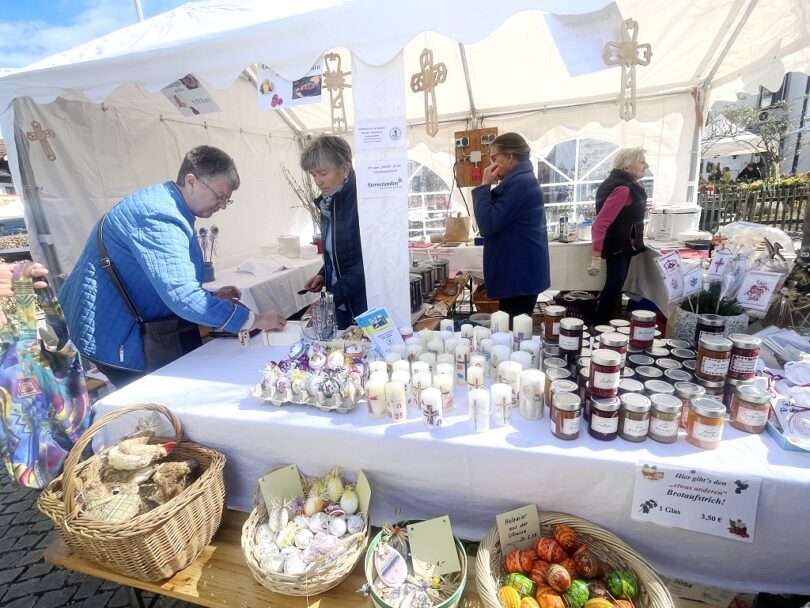 Mit bestickten und hölzernen Eiern aus der Ukraine, mit weiterem österlichen Bastelarbeiten sowie mit selbst gemachtem Marmelade und schmackhaften Frühlingssuppen präsentierte sich der Chiemgauer Helferkreis für die Diözese Ternopil-Ukraine e.V. auf dem Priener Mittfastenmarkt.