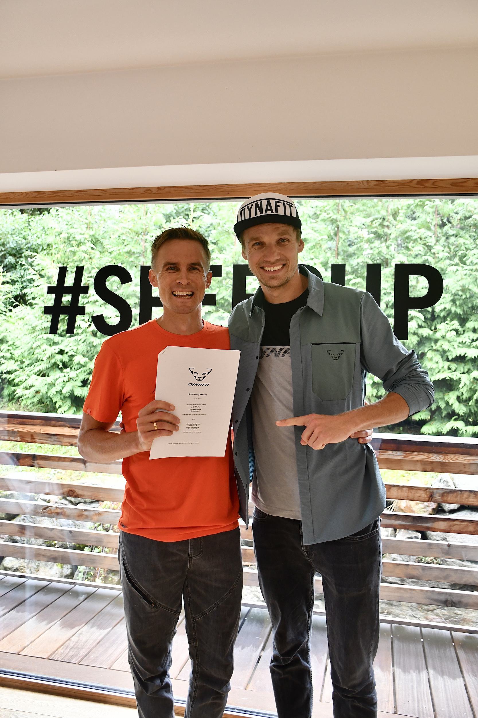 Rechts: Namberger und DYNAFIT verlängern ihre Partnerschaft um weitere vier Jahre, hier zusammen mit DYNAFIT Athletenmanager Lukas Naegele © DYNAFIT