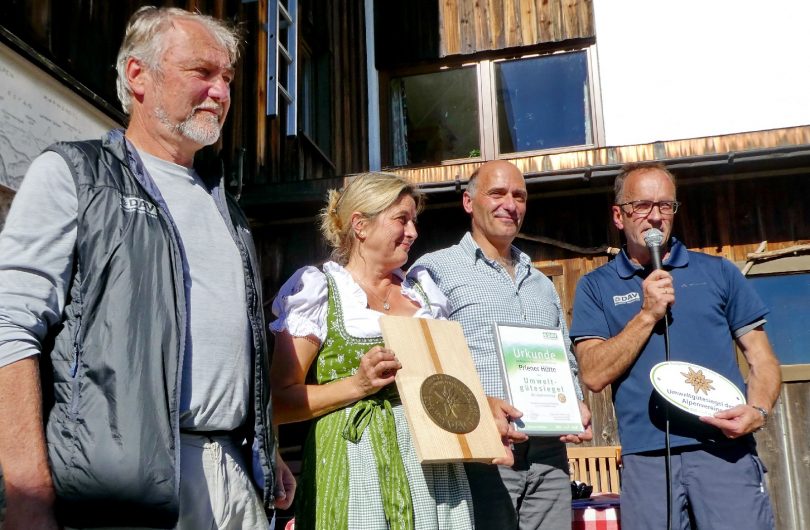 Fotos: Hötzelsperger – von links: Roland Stierle, Monika Brecht, DAV-Vorstand Josef Buchner und Hanspeter Mair bei der Verleihung des Umweltgütesiegels des Alpenvereins für die Priener Hütte.