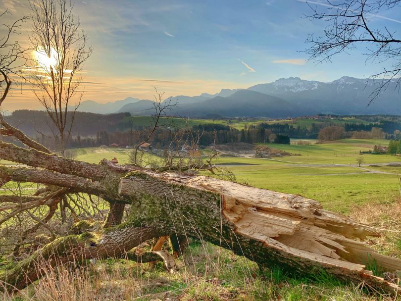 Die aktuelle Situation wegen dem Corona-Virus verdeutlicht es einem wieder, dass unvorhergesehene Dinge uns plötzlich vor neue Herausforderungen stellen. Auf dem geplanten Weg ist plötzlich eine Hürde zu überwinden, wie es synchron diese Aufnahme verdeutlicht. So liegt neben der St. Florians Kirche bei Frasdorf dieser alte Baum, der durch nur einen Windstoß in zwei Teile gespalten wurde. Trotzdem regt der Blick zur ins Tal und dazu die aufgehende Sonne im Osten zu einem Neuanfang an jedem Tag immer wieder an.