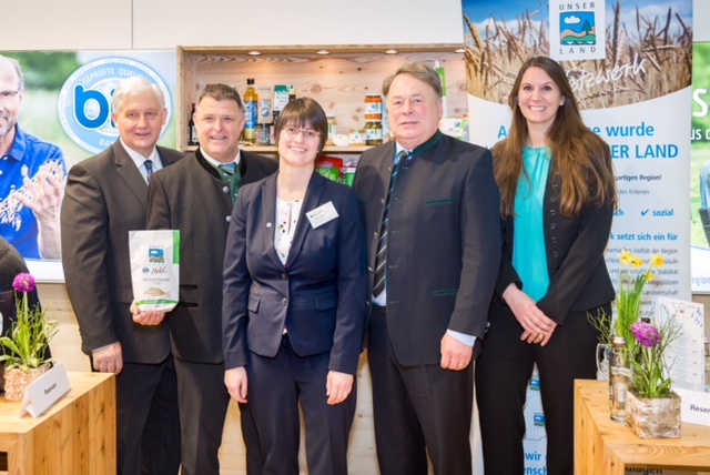 Bei seinem Besuch auf der BIOFACH in Nürnberg hat Landwirtschaftsminister Helmut Brunner beim bayernweiten Netzwerk „Unser Land“ vorbeigeschaut. Geschäftsführerin Julia Seiltz und Vertriebsleiter Steffen Wilhelm informierten den Minister über die Entwicklung und das Konzept von „Unser Land“, das seit fast 25 Jahren auf geschlossene regionale Kreisläufe setzt. Das Bayerische Bio-Siegel, das auf Initiative Brunners vor gut zwei Jahren eingeführt wurde, sei für das Netzwerk eine ideale Möglichkeit, den Kunden die Verbindung von regionaler Herkunft und hohen Qualitätsanforderungen zu signalisieren. „Das weiß-blaue Zeichen hilft den Verbrauchern, gezielt nach Bio-Lebensmitteln aus Bayern zu greifen“, sagte der Minister. Durch seine einfache, klare und einprägsame Kennzeichnung sorge das Siegel für Transparenz und Verlässlichkeit. „Unser Land“ verwendet das Siegel bereits für 39 seiner Produkte, weitere 16 sind beantragt. Bayernweit werden mittlerweile von 130 Zeichennutzern mehr als 1 000 Produkte mit dem Siegel angeboten.