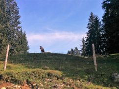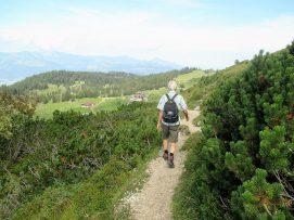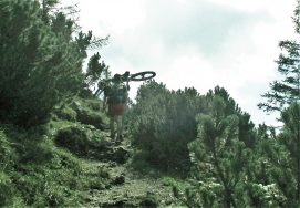 Nachdem wir den Ausblick ausgiebig genossen haben, laufen wir hinunter zur Eggenalm. Beim Abstieg kommt uns ein Mountainbiker entgegen, der sein Radl über die Schulter geworfen hat. Es gibt schon extreme Typen! Von der Eggenalm geht es dann durch Lärchenwald und Hochalmweiden zurück zur Hindenburghütte. Wir sind froh, daß wir jetzt wieder in den Shuttlebus einsteigen können, denn mit der Gipfelbesteigung des Fellhorn war es doch für uns als Angehörige der Generation 70+ eine ganz schöne Gewalttour.