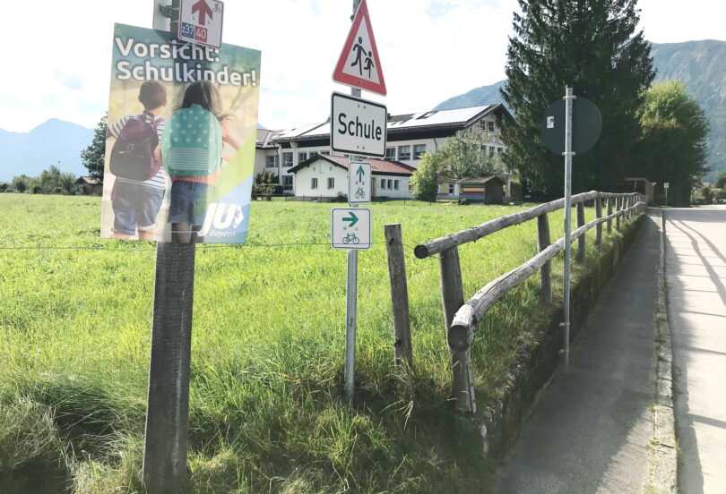 Beitrag und Bild: Klaus Hellmich, Unterwössen – Das Bild zeigt eines der mehrjährig wiederverwendbaren, witterungsbeständigen Kunststoffhohlkammerplakate, hier angebracht an der Kreuzung Alte Dorfstraße zur Wetterkreuzstraße mit Blick auf die Grund- und Mittelschule Unterwössen. Bild: Klaus Hellmich, Unterwössen.