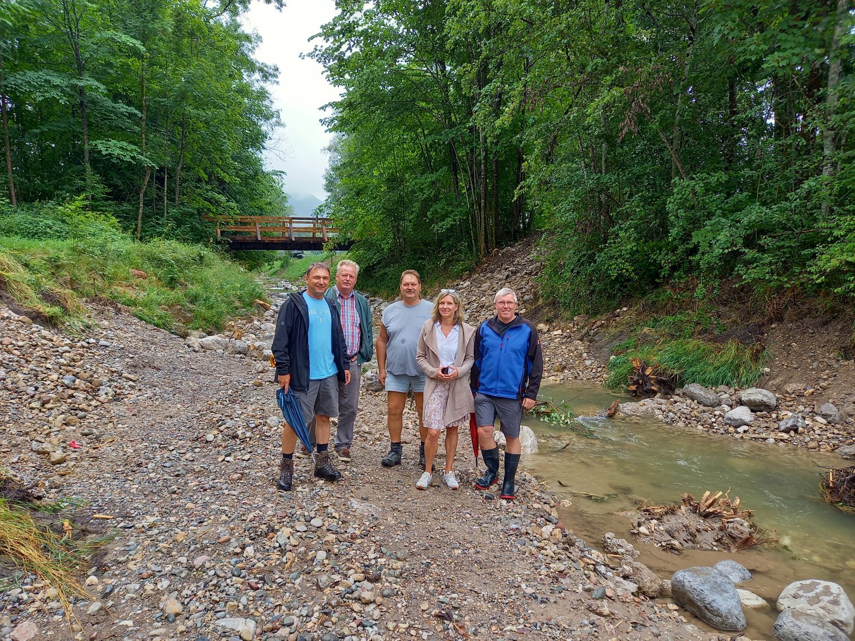 Der Unterwössener Bürgermeister Ludwig Entfellner (Zweiter v.l.) und die stellvertretende Bauamtsleiterin der Kommune, Jana Schmidt-Hindinger, besuchen die Baustelle am Wössener Bach in Unterwössen. Die beiden Mitarbeiter des Traunsteiner Wasserwirtschaftsamtes, Andreas Philipp (l.) und Stefan Hollrieder (r.) erläutern die ökologische Umgestaltung des Baches. Baggerfahrer Charly Moser sorgt dafür, dass rund 200 Tonnen Steine richtig angeordnet und verbaut werden. Foto: Wasserwirtschaftsamt Traunstein