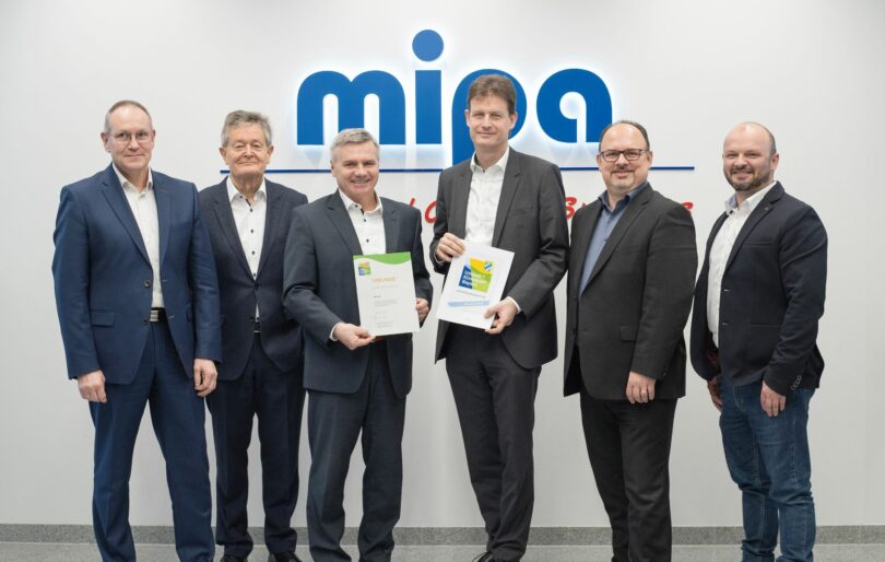 Der „kooperative Umweltschutz zwischen Staat und Wirtschaft mit Ziel eines nachhaltigen Wachstums“ – das hat sich der Umweltpakt Bayern zur Aufgabe gemacht: Die MIPA SE aus Essenbach mit ihren rund 600 Mitarbeiterinnen und Mitarbeitern am Standort gehört ebenfalls dazu. So hat das Unternehmen die Kooperationsvereinbarung mit dem Bayerischen Umweltministerium verlängert und weiter in Produktion und Verwaltung investiert, um auch auf regionaler Ebene die Mitverantwortung für eine ökologisch verträgliche Form des Wirtschaftens zu unterstreichen. Für dieses Engagement im Sinne umweltverträglichen Wirtschaftswachstums hat das Umweltministerium dem Unternehmen eine Anerkennungsurkunde verliehen, die Landrat Peter Dreier dem Vorstandsvorsitzenden Markus Fritzsche zusammen mit Aufsichtsratsvorsitzendem Berndt Fritzsche sowie ihren verantwortlichen Mitarbeitern überreicht hat.