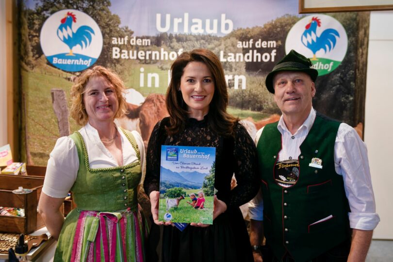 Titelbild: v.l.n.r. Nicole Schneider, Tourismusministerin Michaela Kaniber, Josef Esterer am Stand von Urlaub auf dem Bauernhof – Berchtesgadener Land-Rupertiwinkel