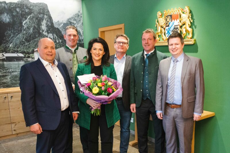 Bericht und Bilder: Bayer. Landwirtschaftsministerium – 1. Foto zeigt Landwirtschaftsministerin Michaela Kaniber mit einem Frühlingsstrauß als Valentinsgeschenk. Foto: Judith Schmidhuber/StMELF. 2 Foto zeigt die Spitzenvertreter bei ihrem Besuch im Ministerium. Es zeigt v.l. Herbert Puffer (Vizepräsident und Schatzmeister des Bayerischen Gärtnerei-Verbandes e.V.), Mario Nast (Inhaber eines Garten- und Landschaftsbaubetriebs in Unterbrunn/Gauting und Mitglied im Verband Garten-, Landschafts- und Sportplatzbau Bayern e.V.), Staatsministerin Michaela Kaniber, Patrick Schmidt (stellv. Verbandsdirektor Verband Garten-, Landschafts- und Sportplatzbau Bayern e.V.), Willi Enßlin (Vizepräsident des Bayerischen Gärtnerei-Verbandes e.V.) und Felix Punzmann (Vorstandsmitglied Bund deutscher Baumschulen, Landesverband Bayern e.V.). Foto: Stefanie Büchl/StMELF.