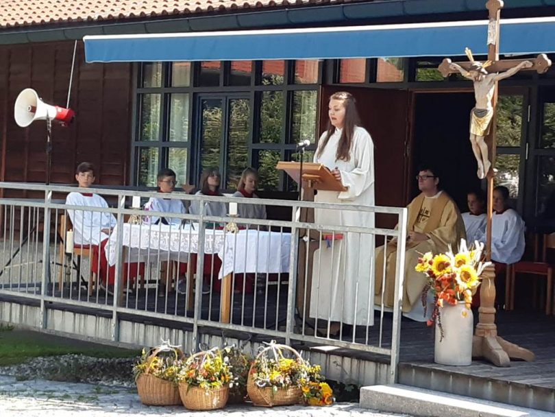 Bei strahlendem Sonnenschein und fast schon zu hohen Temperaturen (aber von Regen hatten wir in diesem Sommer genug) fand auf dem Kirchplatz in Riedering das feierliche Patrozinium statt. Mit einer Mischung aus Marienliedern, bekannten Kirchenliedern zum Mitsingen und der Misa Criolla mit südamerikanischen Wurzeln gestaltete der Kirchenchor unter instrumenteller Begleitung von E-Piano, Gitarre, Schlagzeug und Kontrabass den musikalischen Rahmen für den Gottesdienst.