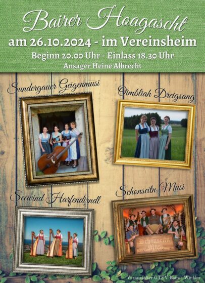 Eine Woche später, am Samstag, 26. Oktober, beginnt um 20.00 Uhr der Bairer Hoagascht, ein Abend voller echter Volksmusik. Mit dabei sind die Sundergauer Geignmusi, der Oimbliah Dreigsang, die Seewind Harfendirndl und die Schonseitn Musi. Durch das Programm führt Heine Albrecht. Einlass ist ab 18.30 Uhr, Karten sind ausschließlich an der Abendkasse erhältlich.